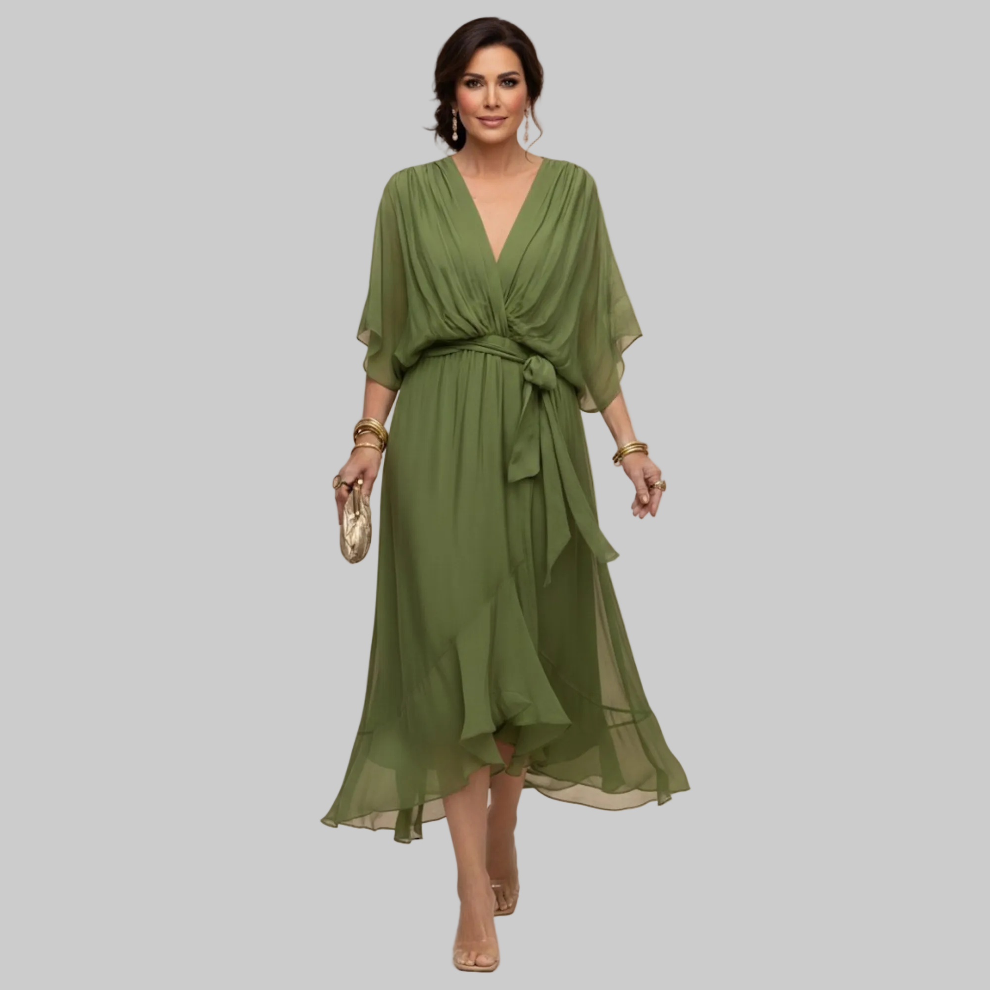 Haljina Sofija savršen je spoj profinjenog dizajna i nevjerojatne udobnosti. Lagana tkanina koja nježno pada pruža vam slobodu kretanja, dok V-izrez i pojas u struku naglašavaju vašu figuru na najsuptilniji način.